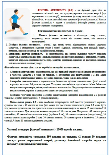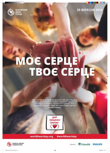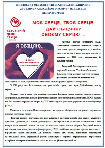 За рішенням Всесвітньої федерації серця щорічно 29 вересня відзначається Всесвітній день серця. Цього дня Всесвітня федерація серця закликає політиків, медиків, організації пацієнтів і приватних осіб активізувати зусилля, спрямовані на зменшення тягаря серцево-судинних захворювань. У 2018 році девіз Всесвітнього дня серця – «Моє серце, твоє серце. Дай обіцянку своєму серцю ... ». Основна увага в цьому році приділяється таким факторам ризику розвитку серцево-судинних захворювань, як куріння, низька фізична активність і нераціональне харчування. Серцево-судинні захворювання (ССЗ) залишаються основною причиною смерті в світі: вони щорічно забирають 17,5 мільйона людських життів, і, якщо не вжити заходів, це число до 2030 року становитиме 23 мільйони чоловік. ССЗ сьогодні є причиною 67% усіх смертей українців, тому важливо доносити інформацію про кроки, які допоможуть знизити цю сумну статистику.